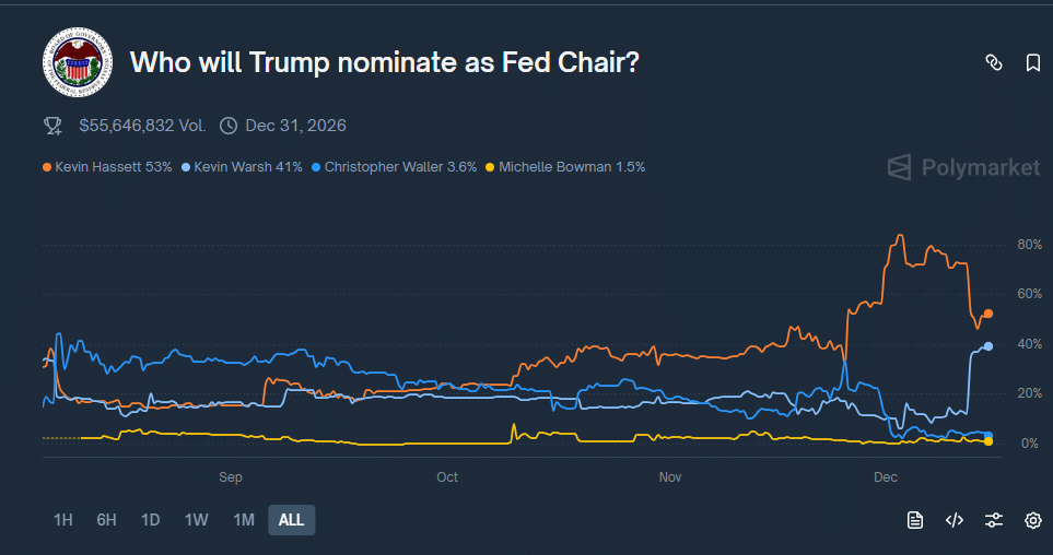 Polymarket odds vaulted from 13% to 36% after reports that President Trump has narrowed the field to two men: Kevin Hassett and Warsh. The market still gives Hassett the edge at 56%, but the swing toward Warsh signals that traders believe Trump may prefer a more aggressive rate-cut advocat,